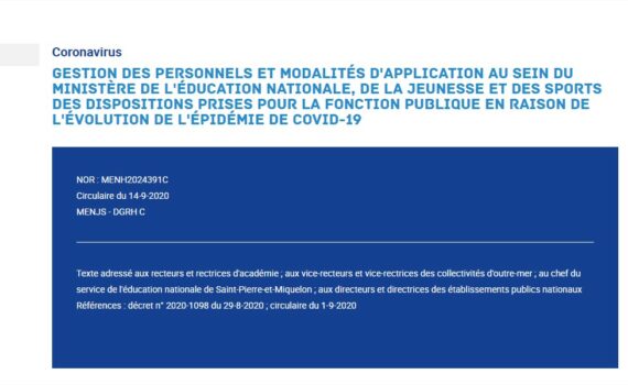 La présente circulaire a pour objet, s’agissant de la gestion des personnels, de préciser les modalités d’application au sein de notre ministère des dispositions prises pour la fonction publique de l’État en raison de l’évolution de l’épidémie de Covid-19. Elle concerne les écoles, les établissements publics d’enseignement, les services et […]