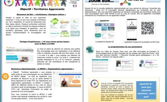 La newsletter OTA du 15 septembre 2020 est disponible Avec « Enseigner dehors » d’Archiclasse, les sciences en 1 ou 2h avec La Main à la Pâte , le premier MOOC OTA62 sur les organisations apprenantes et le 1er speed’ lab sur « Jouer pour apprendre ». Elle est disponible à l’adresse suivante : […]