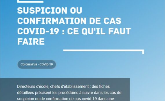 Directeurs d’école, chefs d’établissement : des fiches détaillées précisent les procédures à suivre dans les cas de suspicion ou de confirmation de cas covid-19 dans une école, un collège ou un lycée. Retrouvez l’ensemble des informations via le lien suivant : https://www.education.gouv.fr/suspicion-ou-confirmation-de-cas-covid-19-ce-qu-il-faut-faire-305730