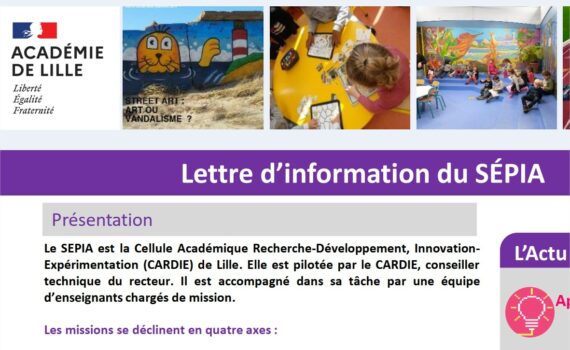 Le SEPIA est la Cellule Académique Recherche-Développement, Innovation-Expérimentation (CARDIE) de Lille. Elle est pilotée par le CARDIE, conseiller technique du recteur. Il est accompagné dans sa tâche par une équipe d’enseignants chargés de mission. Retrouvez la lettre d’information du SEPIA à l’adresse suivante : http://ota62-medias.ac-lille.fr/espace62/cardiesepiasept2020.pdf