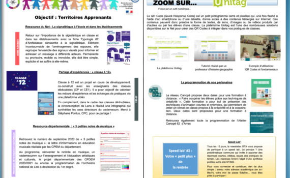 La newsletter OTA du 29 septembre 2020 est disponible avec un dossier signalétique d’Archiclasse, un partage de ressources Classe à 12, la lettre d’information des conseillers pédagogiques départementaux en éducation musicale et un zoom sur les QR-codes. Elle est disponible à l’adresse suivante : https://ota62.site.ac-lille.fr/nos-publications/
