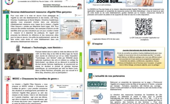 Au sommaire : Devenez établissement ressource “Egalité filles garçons” Podcast “Technologie, nom féminin” MOOC “Chaussons les lunettes de genre” Zoom sur l’application “Mission Egalité filles garçons 62” S’inspirer avec les actions du lycée André Malraux de Béthune autour de la journée des droits de la femme L’agenda de nos partenaireshttps://ota62.site.ac-lille.fr/2022/03/08/la-newsletter-ota-58-est-en-ligne/
