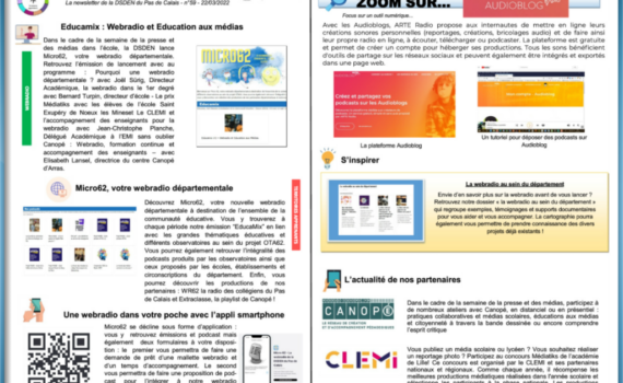 Au sommaire : Educamix : Webradio et Education aux médias Micro62, votre webradio départementale Une webradio dans votre poche avec l’appli smartphone Zoom sur les audioblogs d’Arte S’inspirer avec notre dossier “La webradio au sein du département” L’agenda de nos partenaires http://ota62-medias.ac-lille.fr/newsletter/newsletter59/mobile/index.html