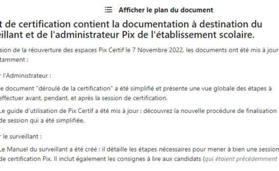 A l’occasion de la réouverture des espaces Pix Certif le 7 Novembre 2022, les documents du Kit de Certification ont été mis à jour avec notamment : Pour l’Administrateur : le document “déroulé de la certification” a été simplifié et présente une vue globale des étapes à effectuer avant, pendant, […]