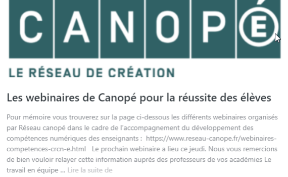 Pour mémoire vous trouverez sur la page ci-dessous les différents webinaires organisés par Réseau canopé dans le cadre de l’accompagnement du développement des compétences numériques des enseignants : https://www.reseau-canope.fr/webinaires-competences-crcn-e.html