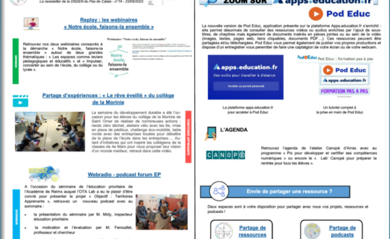 Au sommaire : Replay : nos webinaires « Notre école, faisons-la ensemble » Partage d’expériences : « le rêve éveillé » du collège de la Morinie Webradio : le podcast du forum « Education Prioritaire » de l’Académie de Reims Zoom sur Pod Educ L’agenda de nos partenaires https://ota62.site.ac-lille.fr/la-newsletter-ota-74-est-en-ligne/