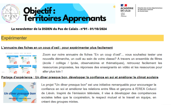 Au sommaire : – L’annuaire des fiches « en un coup d’oeil » pour expérimenter plus facilement – Partage d’expérience : un diner presque bon pour développer la confiance en soi et améliorer le climat scolaire – Webradio : le 1er épiosde de « Histoire chez nous » de l’école Bucaille de Boulogne sur […]