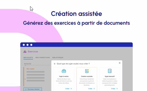 À partir de vendredi prochain, une nouvelle fonctionnalité sera disponible dans l’application Exercices : Création assistée. Elle permet aux enseignants de numériser un document papier (fiche, énoncé, devoir, etc.) pour en générer automatiquement un exercice interactif, prêt à être diffusé aux élèves.