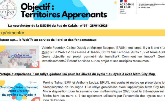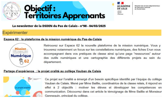 Au sommaire : Espace 62 – la plateforme de la mission numérique du Pas de Calais / Partage d’expérience : le projet oralité au collège Vauban de Calais – Webradio : le podcast « les règles du jeu » au lycée Pablo Picasso d’Avion – Primabord : concours #ZéroCliché – Canopé : […]
