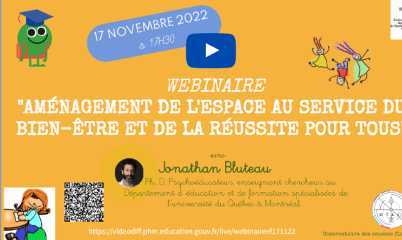 Le jeudi 17 novembre 2022, l’observatoire des espaces flexibles proposait un webinaire intitulé “L’aménagement de l’espace au service du bien-être et de la réussite de tous” avec Jonathan Bluteau, docteur en psychoéducation et chercheur au département d’éducation et de formation spécialisées de l’université du Québec à Montréal. Retrouvez le replay […]