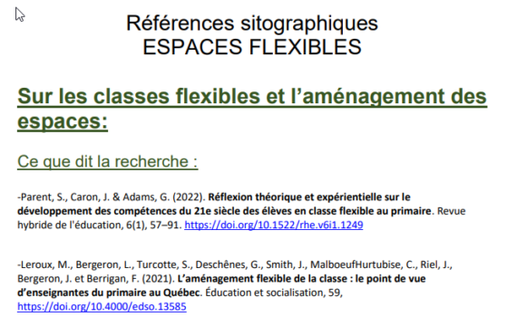 Retrouvez un ensemble de références bibliographiques et sitographiques sur ou en lien avec les classes flexibles et l’aménagement des espaces : Références bibliographiques : https://ota62.site.ac-lille.fr/2021/06/29/references-bibliographiques-espaces-flexibles/ Références sitographiques : https://ota62.site.ac-lille.fr/2021/06/29/references-sitographiques/