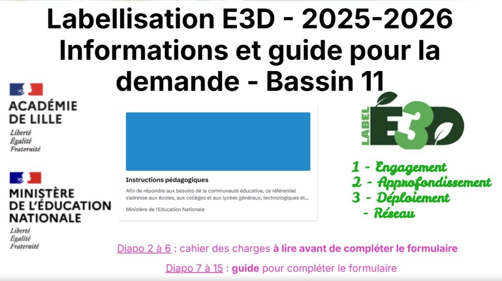 Dans le cadre du dispositif national  » Établissement en Démarche de Développement Durable « (E3D) une nouvelle campagne de labellisation est lancée, au titre de l’année scolaire 2025 – 2026.